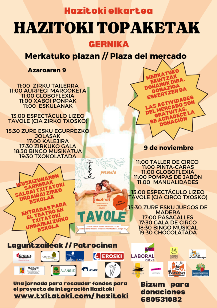 Azaroaren9an “Hazitoki Topaketak” izango dira berriro ere Gernikako merkatuko plazan. Zirkua praktikatzen duten behar bereziak dituzten pertsonek egindako lana ikusarazteko sortutako topaketa hau aurten itzuliko da gizarte osoa interpelatuz, ahalik eta topaketa pluralena eta abegikorrena izan dadin. Edizio berri honetarako, Hazitoki elkarteak jarduera ugari eta askotarikoak programatu ditu familia osoarentzat, ez bakarrik behar bereziak edo desgaitasunen bat duten pertsonenentzako, Hazitokiren espiritua kalera eramateko helburuarekin. Zirku inklusiboaren jardunaldia mundu guztiak zirkuan eta tailer eta jardueretan parte har dezan eta goza dezan erabat irekia.